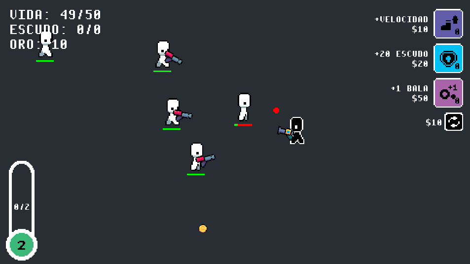 Tip: evita mantener apretado el click es mejor disparar cuando requieras la bala (a no ser que el enemigo tenga mucha vida) y procura matar primero a los que traen bombas. el escudo a diferencia de la vida se comienza a regenerar si no recibes daño por 5 segundos, si matas enemigos sin recibir daño aumentas un multiplicador que aumenta las almas que sueltan los enemigos, las mejoras de la tienda solo afectan al como disparas o estadísticas del jugador, mientras la ruleta este activa los enemigos no aparecen podría ser el mejor momento para comprar mejoras (pero esperaría a ver el resultado de la ruleta podría ser "Limpieza" y si te tocara el slot "Limpieza" pierdes todas las mejoras pero mantienes el oro (podría ser de útil ahorrar si estas suficientemente fuerte).